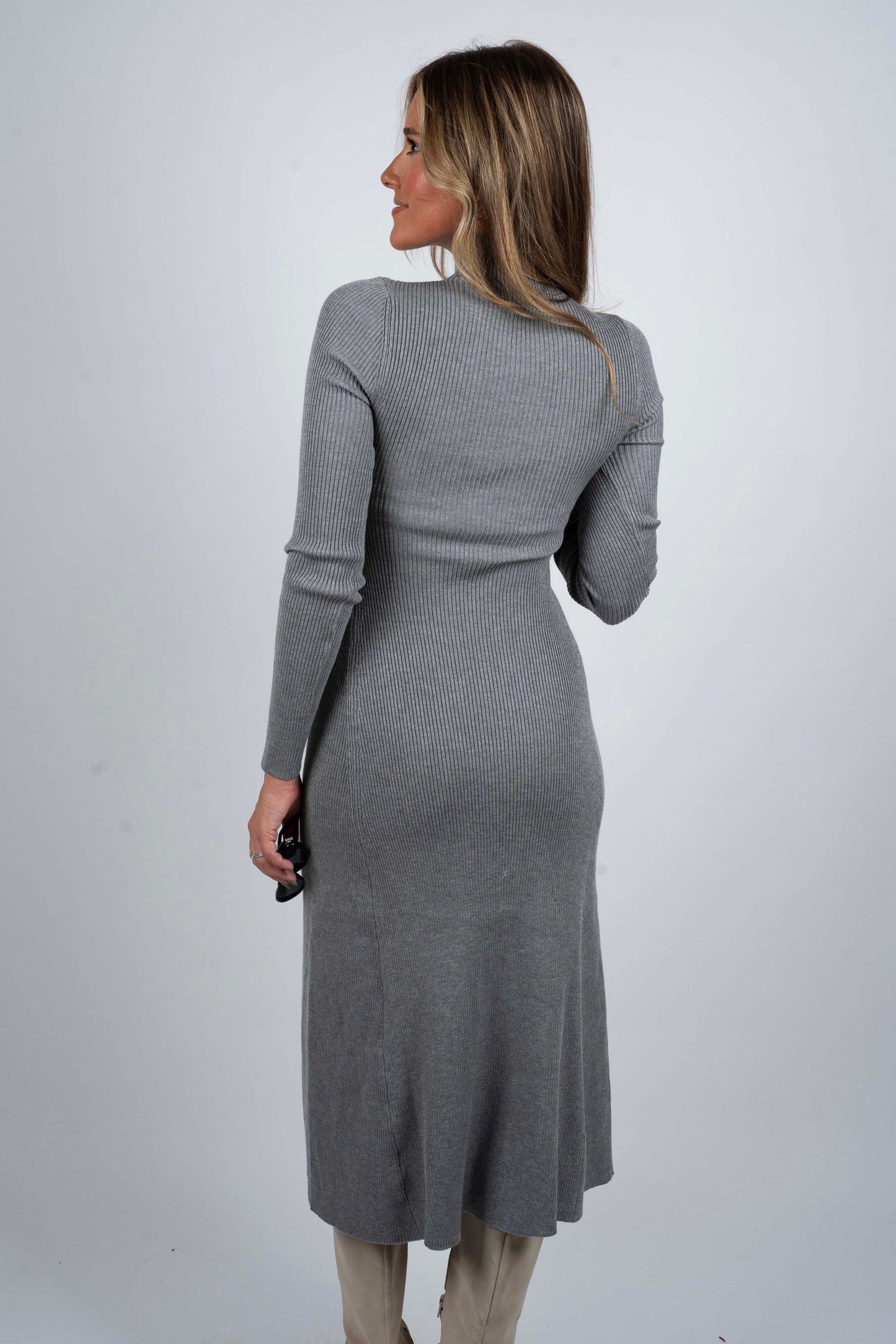 The Perfect Fit Midi Dress features a ribbed design that enhances texture while providing a comfortable stretch. Its mock neck adds a sophisticated touch, making it ideal for both casual and refined settings. The flare silhouette skims the body elegantly, offering a flattering shape and graceful movement. Perfect for a polished look that balances comfort and style effortlessly.