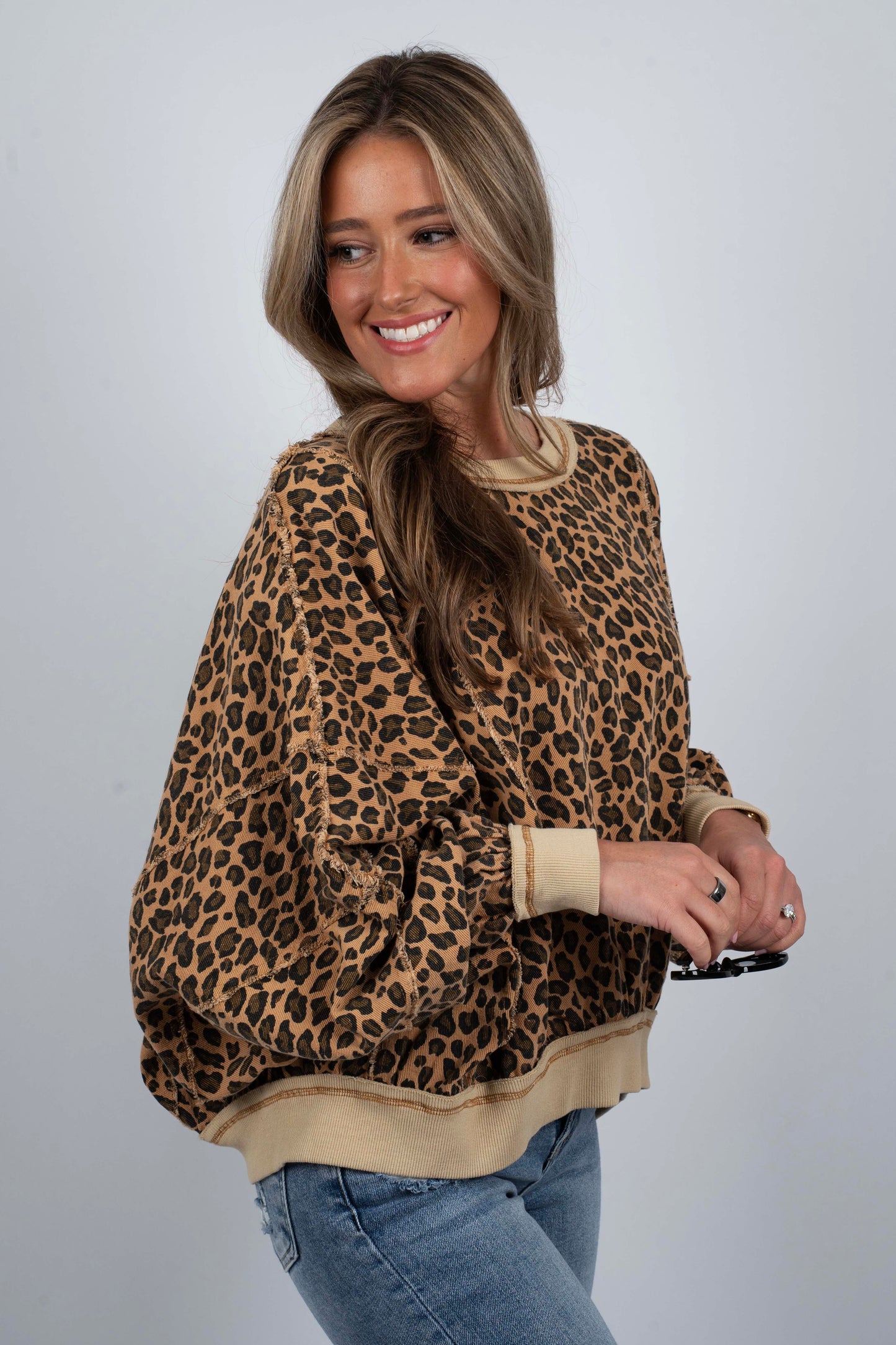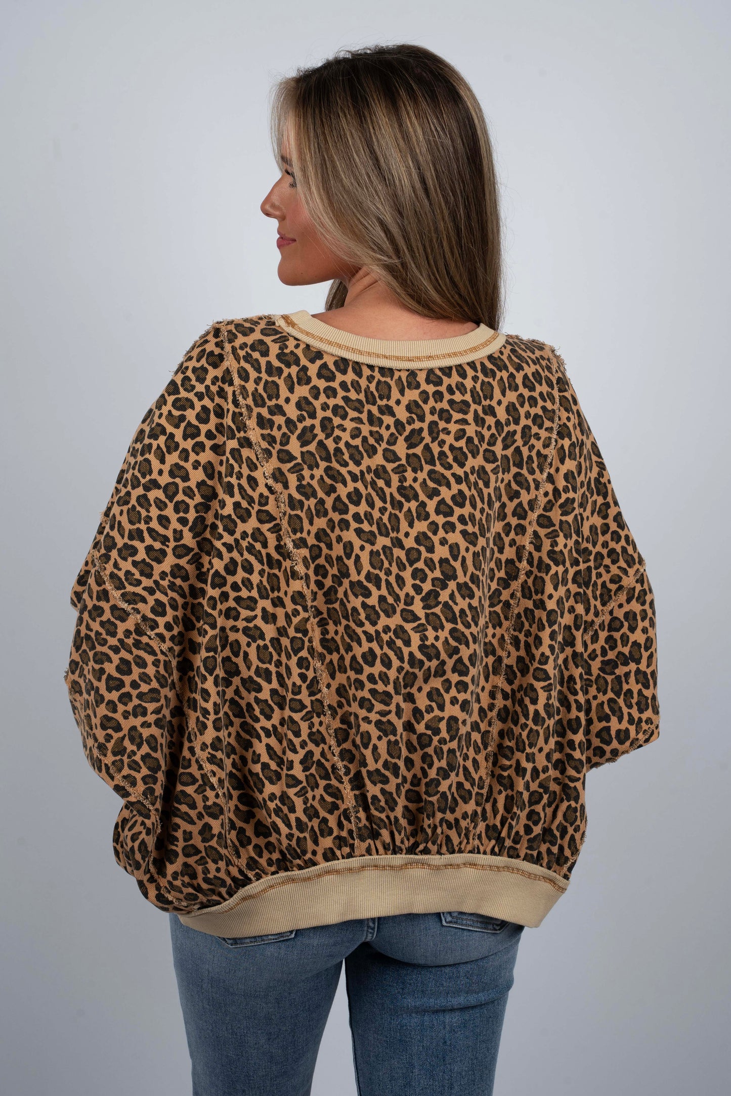 Love The Game Top brings fierce style to your everyday rotation. This leopard print pullover features raw edge seams for an effortlessly cool, undone aesthetic that works whether you're heading to the gym or grabbing coffee with friends. The relaxed fit and textured seams add dimension and attitude to your wardrobe. Perfect for layering or wearing solo, this top is your new go-to for looking put-together without trying too hard.