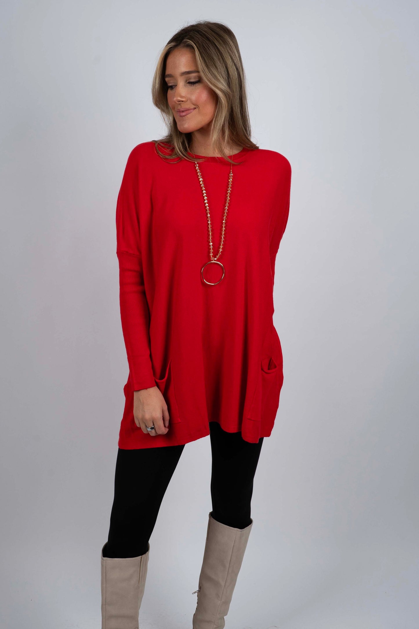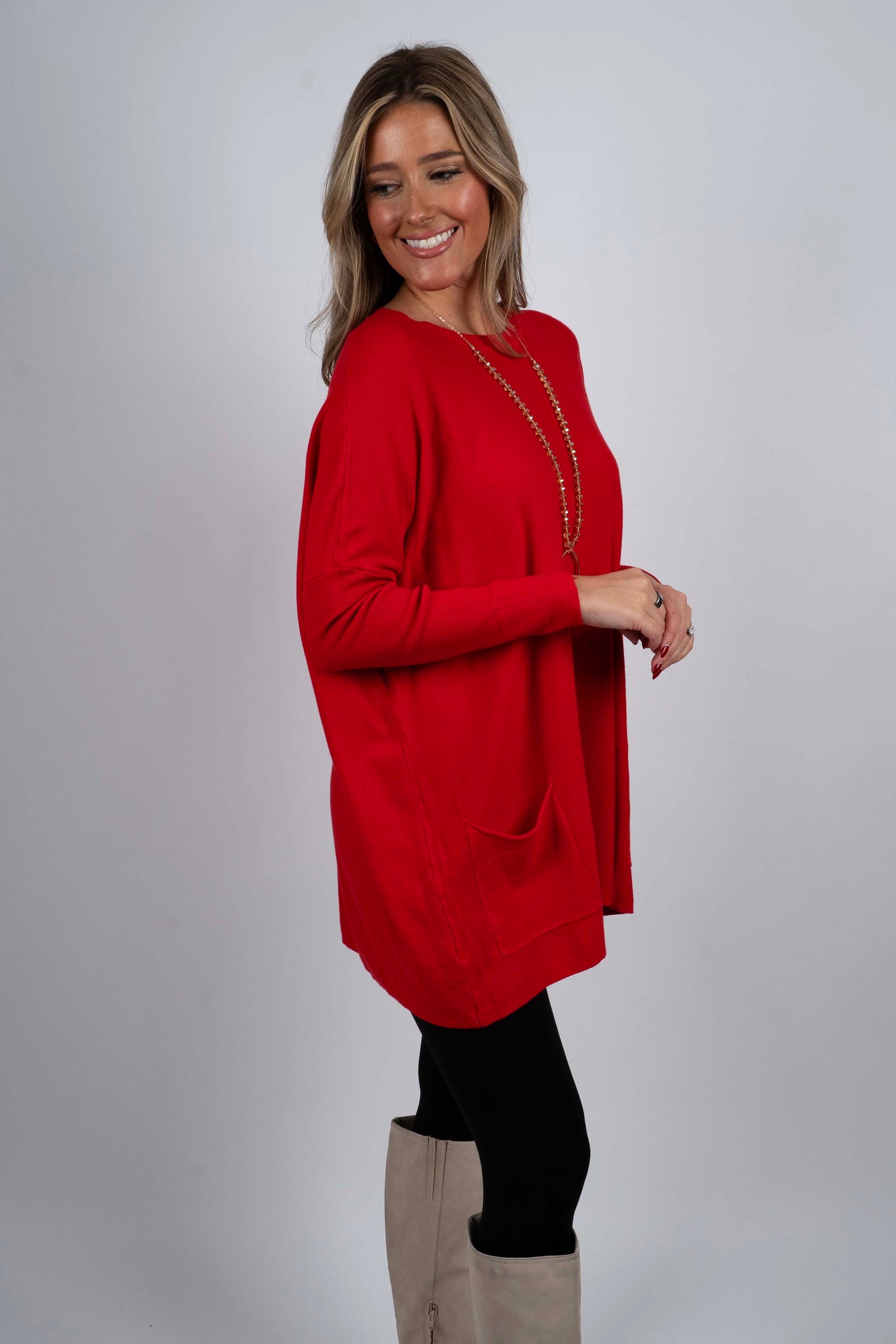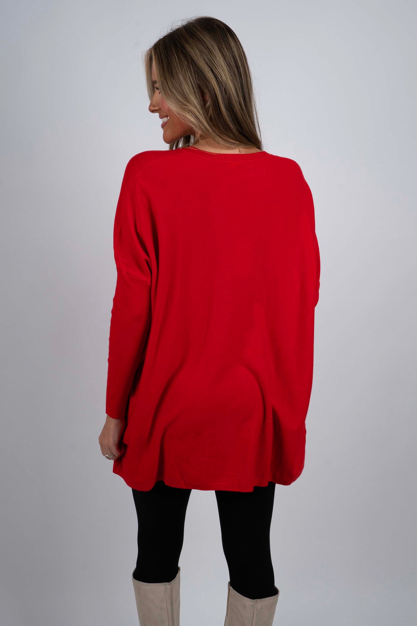 You'll be completely smitten with this gorgeous sweater. This sweater has an oversized fit with front pockets and a crew neck!