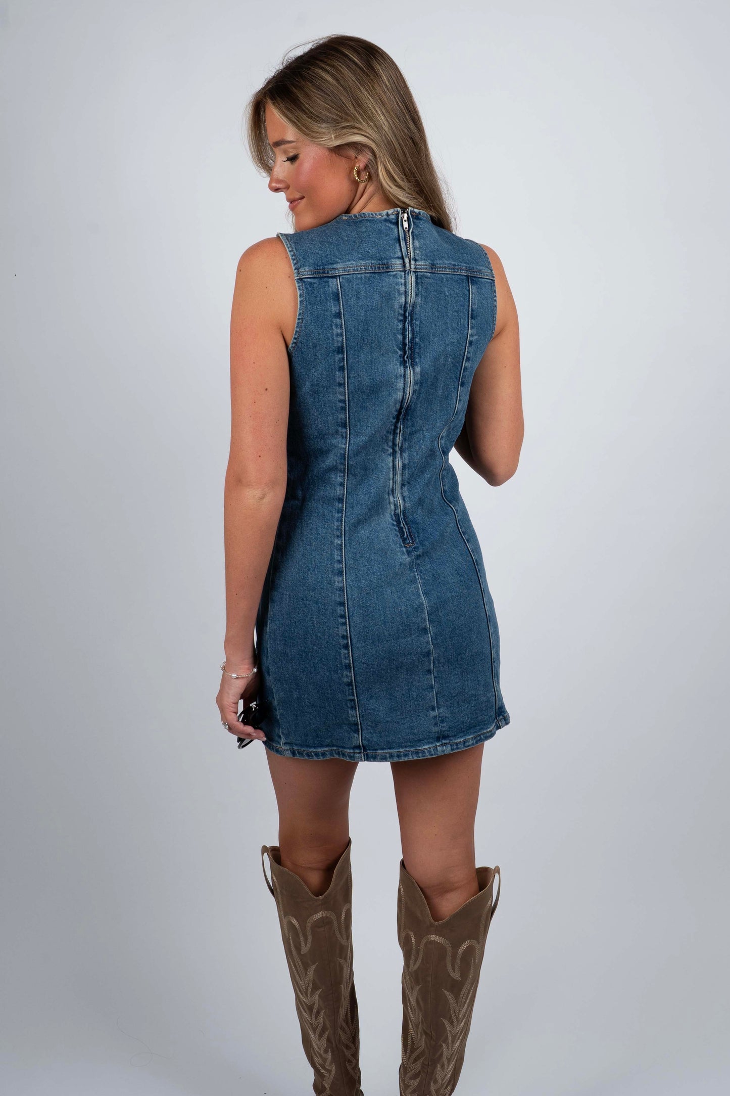 This sleeveless denim dress offers a fitted silhouette that contours the body for a flattering look. Crafted from durable denim fabric, it features a discreet back zipper for easy wear and a streamlined finish. Ideal for casual or polished outfits, this dress combines comfort with expert tailoring.