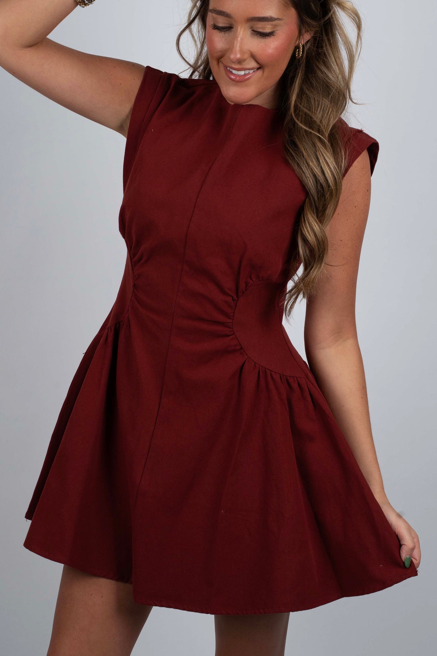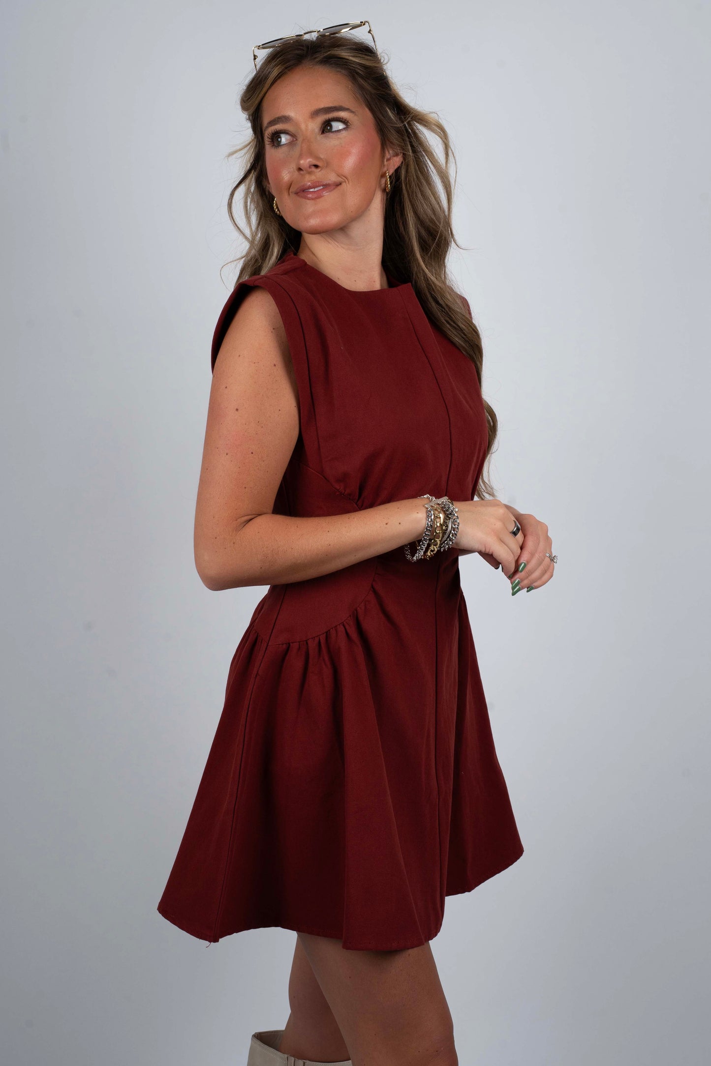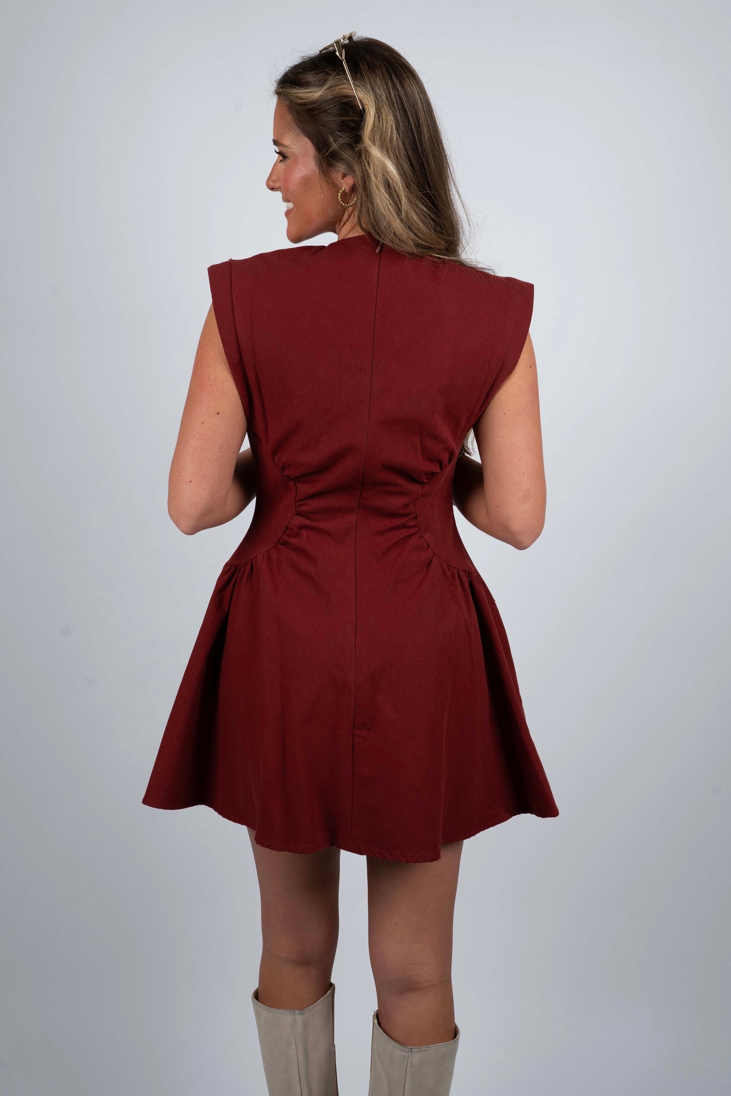Crafted from structured cotton poplin, the Casey Dress features a sleeveless design with extended shoulder details that add a modern edge. Side waist panels with gathering create a tailored, fitted silhouette, while the A-line skirt offers graceful movement. A discreet zip at the back ensures a sleek finish, making this dress a refined choice for both professional and elegant occasions.