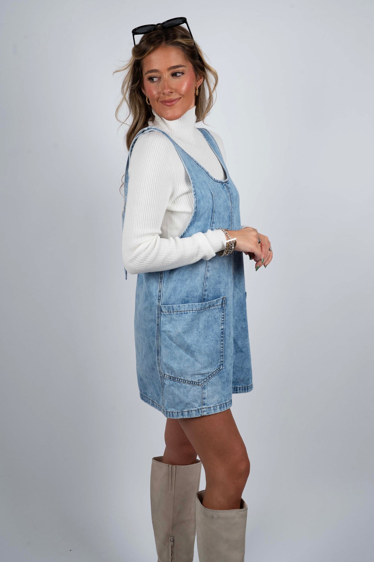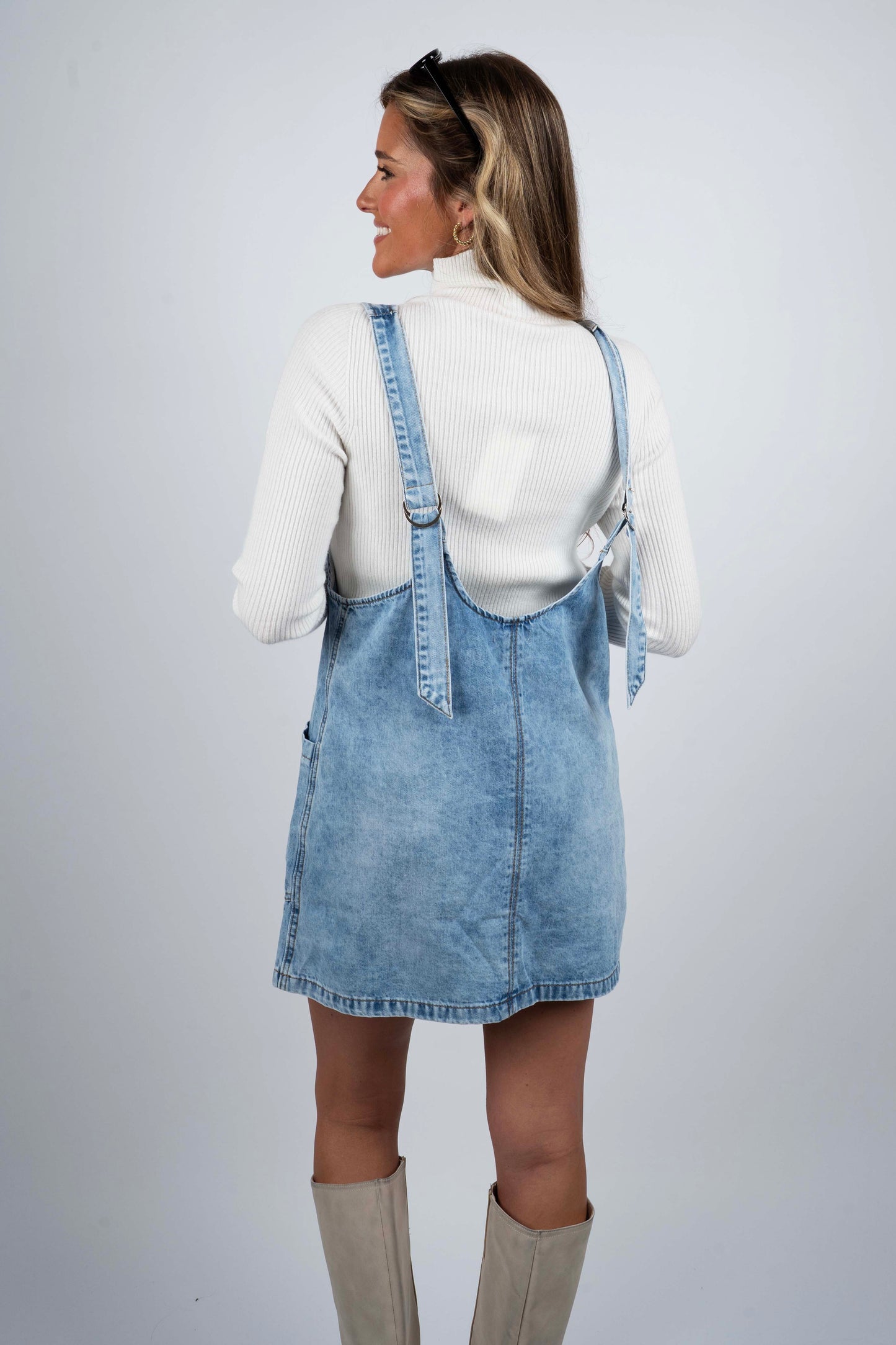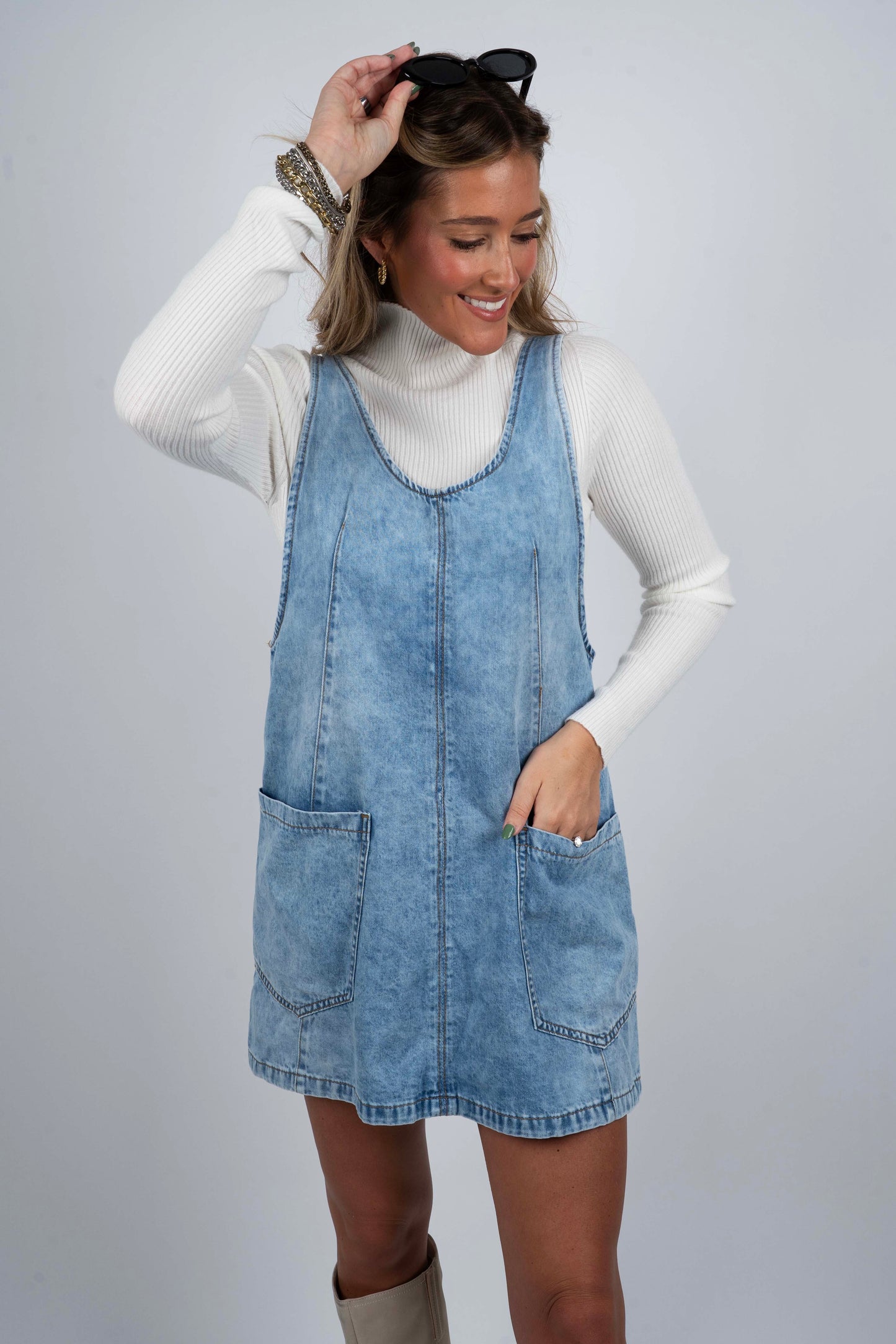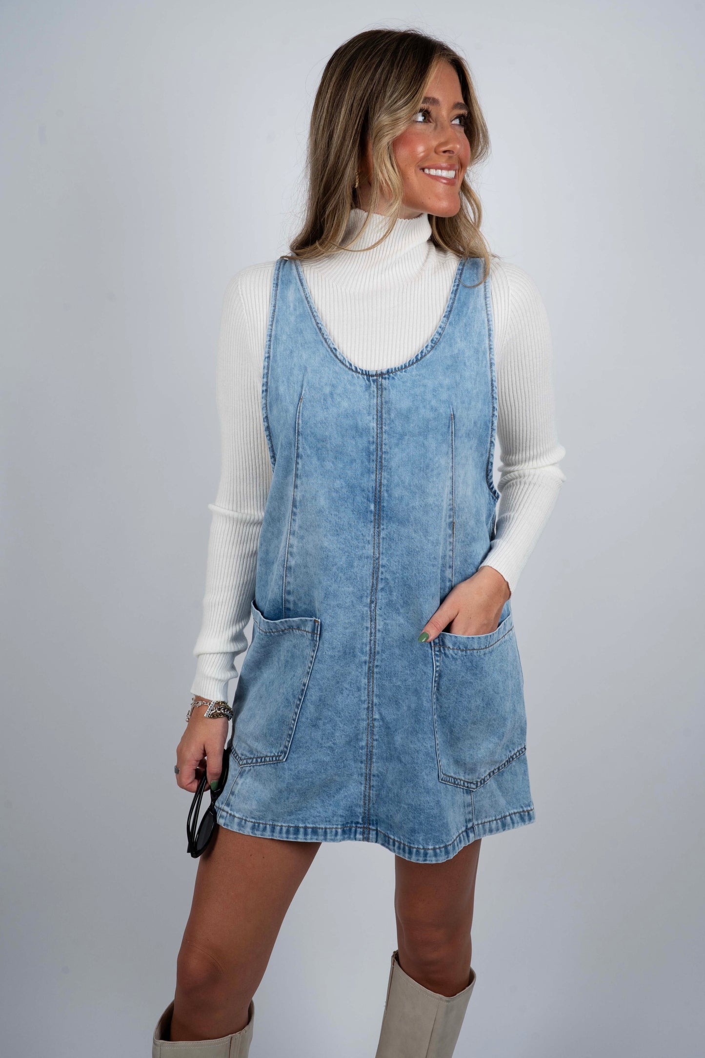 Crafted from durable denim, the Imagine This Overall Dress combines classic style with practical design. Featuring convenient front pockets, it offers easy access to essentials while maintaining a clean, structured silhouette. This versatile piece balances comfort and function, making it ideal for layering or wearing solo in any casual wardrobe.