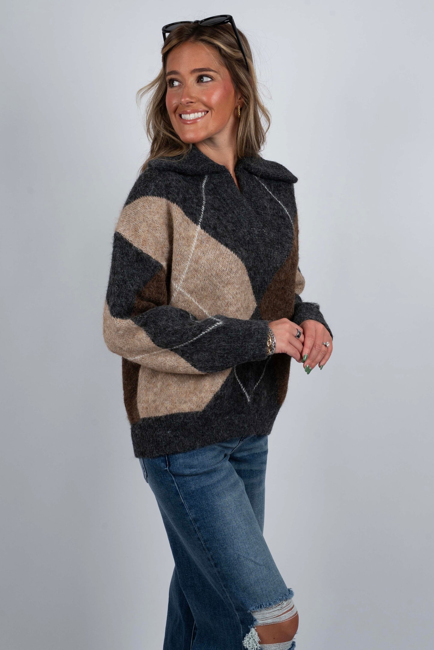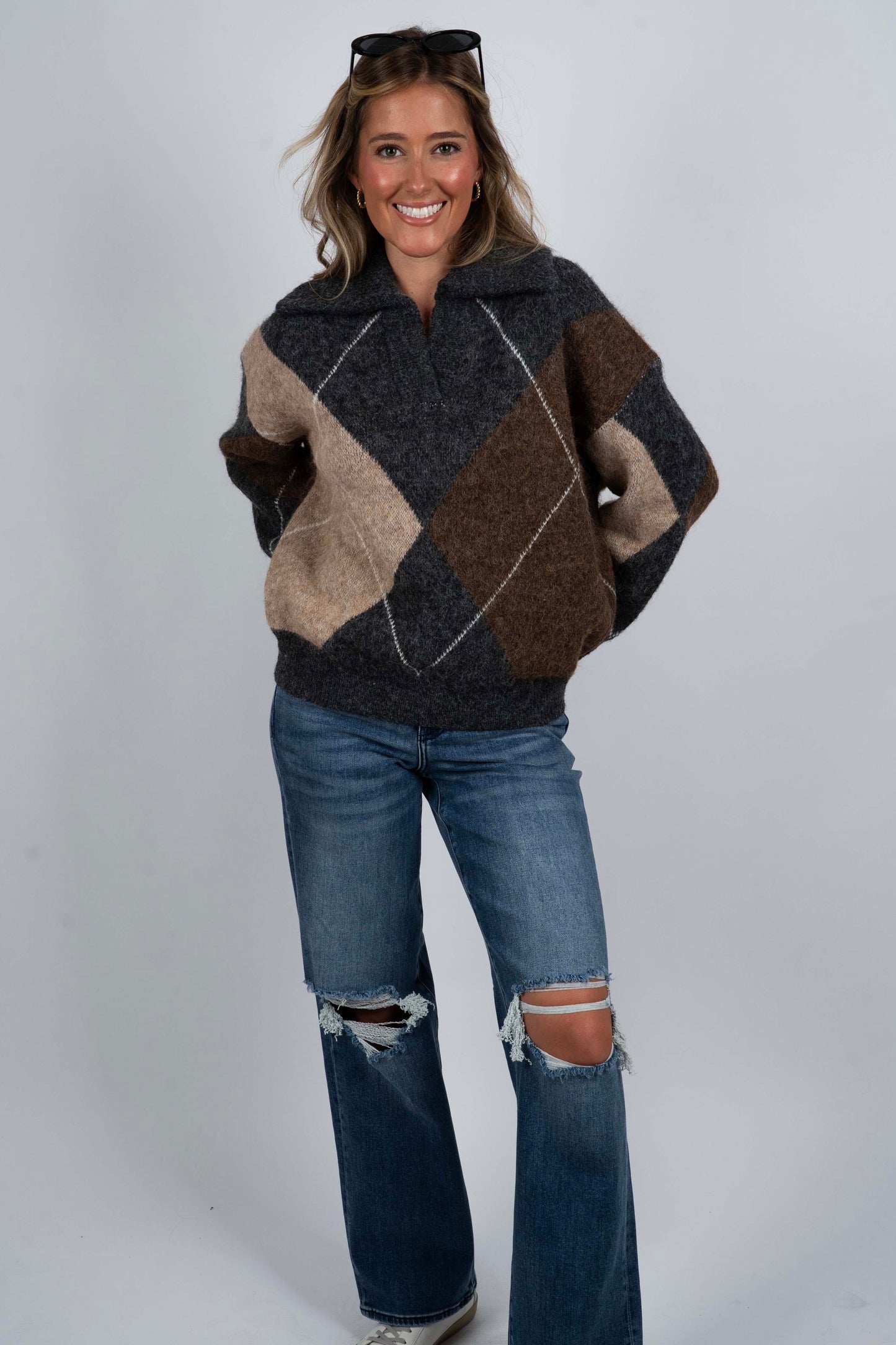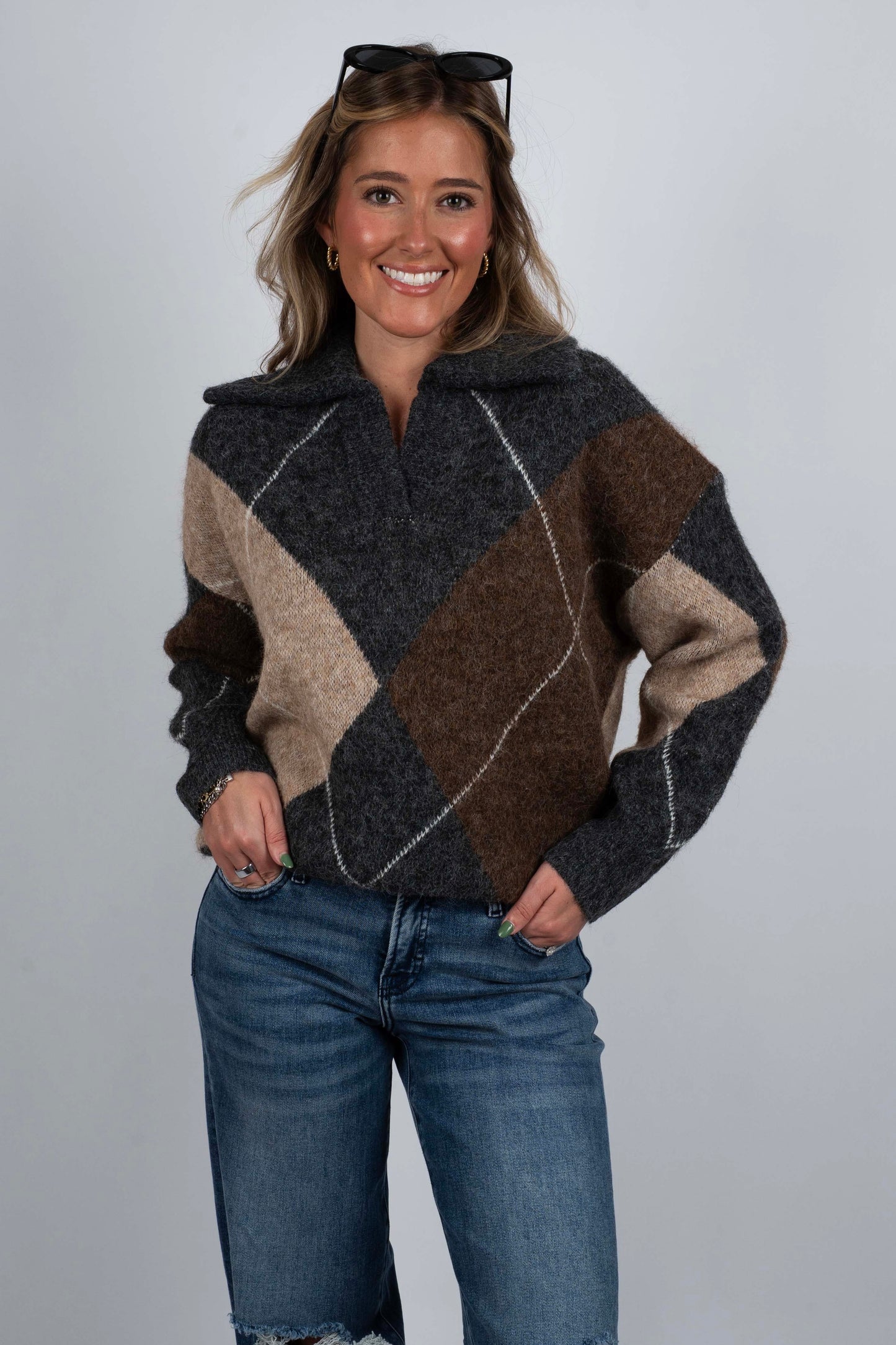 The Prep School Dreams Sweater features a classic V-neck collar and comes in sophisticated shades of brown, navy, and tan. Its timeless argyle pattern adds a refined touch, making it ideal for layering or wearing on its own. Crafted for a polished look, this sweater combines preppy style with versatile colors to elevate your wardrobe essentials.