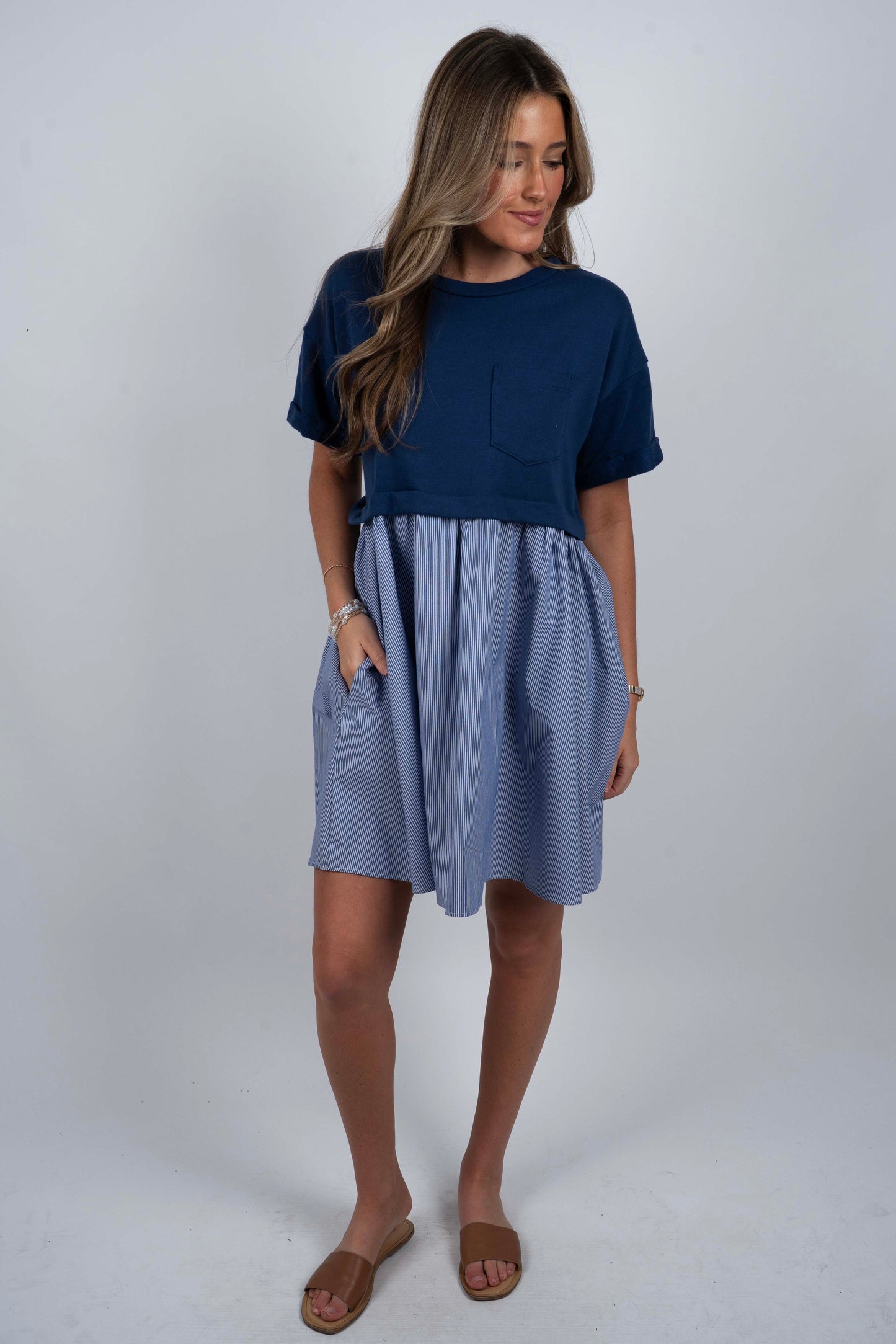 Slip into this precious dress and love the way you look! It has an adorable navy top with a pocket and a contrasting blue and white striped bottom half!